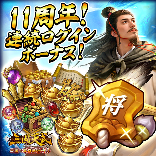 この度は、感謝の気持ちを込めて『三国天武』を支えていただいたお客様に「豪華プレゼント」が詰まった『三国天武11周年記念キャンペーン』を実施します!